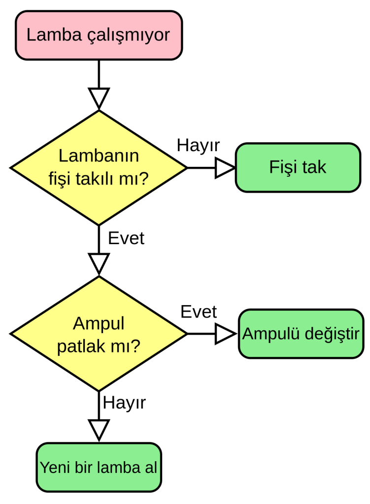 Yandaki örnekte problemimiz çalışmayan bir lamba. Şimdi bu lambanın sorunu ne onu çözmeye çalışacağız. Öncelikle problemimizi belirledik. Problemimiz lambamızın yanmaması. Daha sonra lambamızın fişinin takılı olup olmadığını denetledik. Eğer lambanın fişi takılı mı sorusuna cevabımız hayırsa fişi takarak çözüme ulaşabiliriz. Fiş takılı olduğu halde problem devam ediyorsa ampul patlak mı sorusuna geçiyoruz. Bu soruya cevabımız evetse ampulü değiştirip çözüme ulaşabiliriz ancak soruya cevabımız hayırsa çözümü lambayı değiştirmek olarak buluyoruz. Bu örnekte olduğu gibi öncelikle problemimizi belirleyip daha sonra akış şeması yardımıyla sonuca ulaşıyoruz. Şimdi geçelim algoritma eğitiminde faydalanabileceğimiz uygulamalara. İlk uygulamamızın adı CodeMonkey.